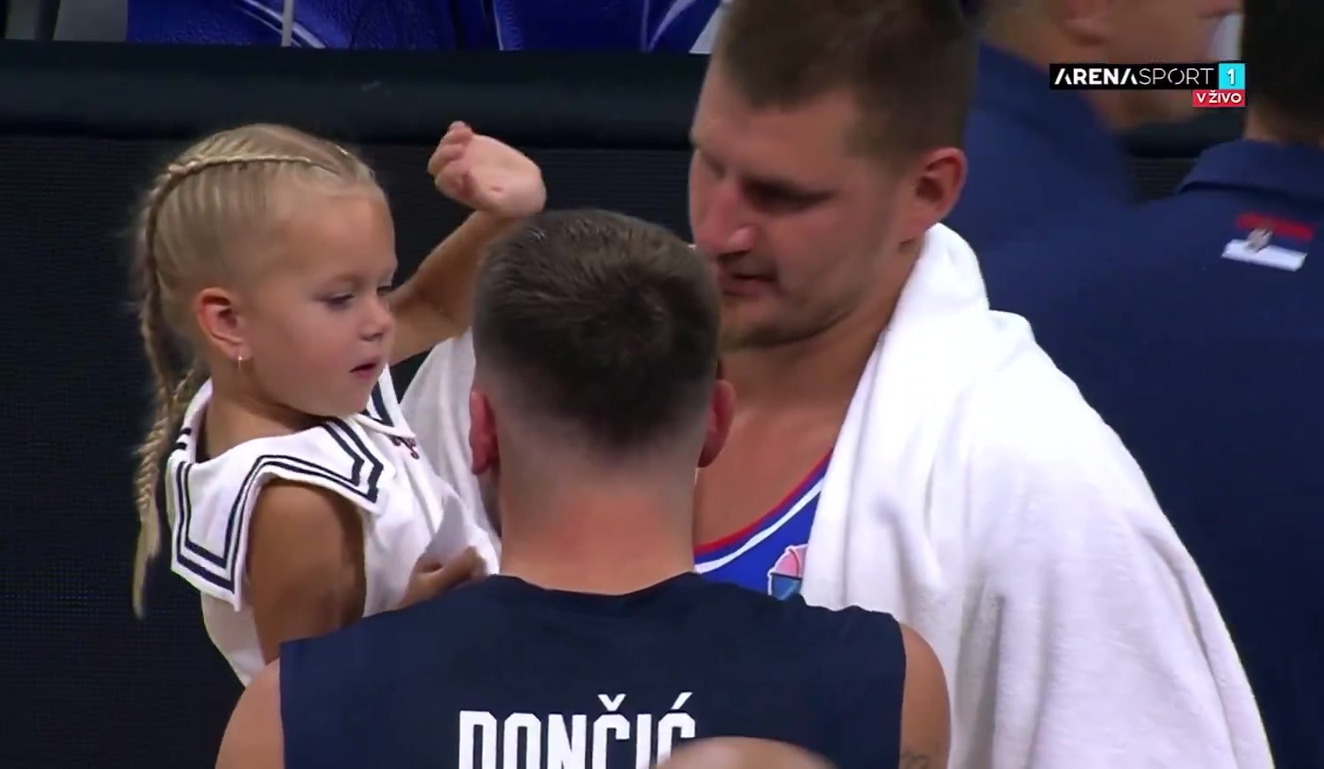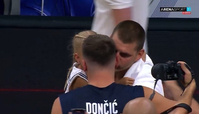 赛后出现温馨一幕:约基奇与东契奇亲密互动,前者轻吻后者的面颊表达致意。